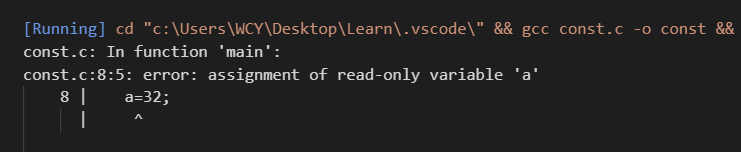 {const int a = 1;char const b =2;a=32;printf("%d,%d",a,b);return 0;}