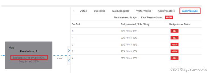 1.13 版本以前是通过周期性对 Task 线程的栈信息采样,得到线程被阻塞在请求 Buffer(意味着下游被阻塞)的频率来判断该节点是否处于反压状态。默认配置下,这个频率在 0.1 以下则为 OK,0.1 至 0.5 为 LOW,而超过 0.5 则为 HIGH。