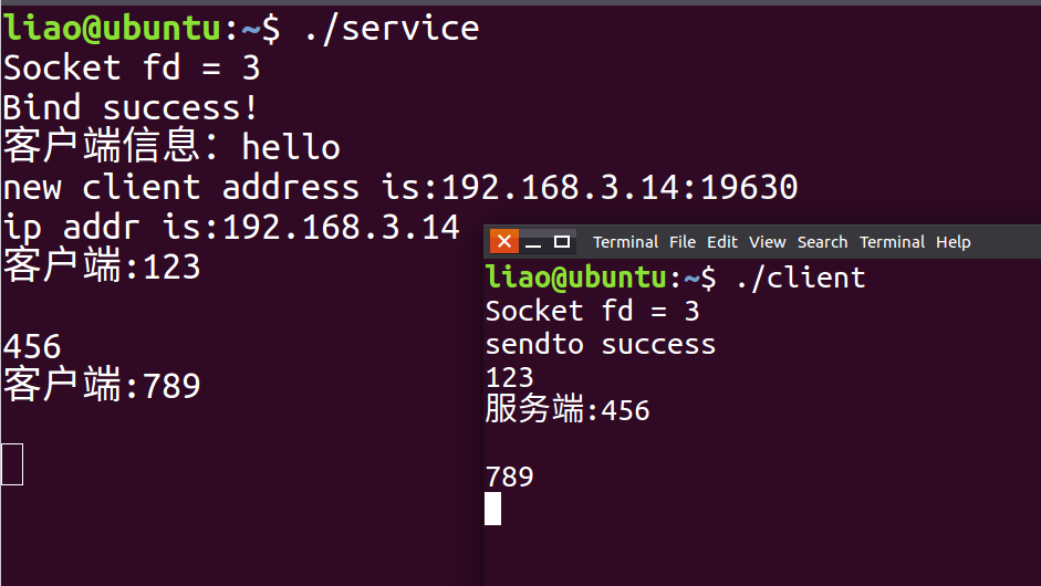 int main() {int sockfd;int ret;// 创建TCP套接字sockfd = socket(AF_INET, SOCK_DGRAM, 0); // 创建一个IPv4的UDP套接字,返回套接字描述符sockfdif (sockfd < 0) {perror("socket创建失败");return -1;}printf("Socket fd = %d\n", sockfd);// 初始化服务器地址结构:、设置IPv4协议族、端口号(PORT_NUM,网络字节序)和服务器IP地址(SERVER_IP)SIN seraddr; socklen_t addrlen = sizeof(seraddr);bzero(&seraddr, sizeof(SIN)); //清零seraddr.sin_family = AF_INET; // 指定使用IPv4地址族seraddr.sin_port = htons(PORT_NUM); // 将主机字节序的端口号转换为网络字节序并赋给端口字段seraddr.sin_addr.s_addr = inet_addr(SERVER_IP); // 将字符串形式的服务器IP地址转换为网络字节序并赋给地址字段ret = sendto(sockfd, "hello", sizeof("hello"), 0, (SA*)&seraddr, addrlen);if(ret > 0) {printf("sendto success\r\n");}//创建父子进程ret = fork();if(ret == 0) { //子进程,接收服务端发送过来的数据char r_buf[10] = {0};while(1) {if(recvfrom(sockfd, r_buf, sizeof(r_buf), 0, (SA*)&seraddr, &addrlen)) {printf("服务端:%s\r\n", r_buf);}memset(r_buf, 0, sizeof(r_buf));}}else { //父进程,发送数据char t_buf[10] = {0};while (1) {fgets(t_buf, sizeof(t_buf), stdin); // 从标准输入读取一行数据到bufsendto(sockfd, t_buf, strlen(t_buf), 0, (SA*)&seraddr, addrlen); // 将buf中的数据发送到指定客户端地址cliaddrmemset(t_buf, 0, sizeof(t_buf));}}}