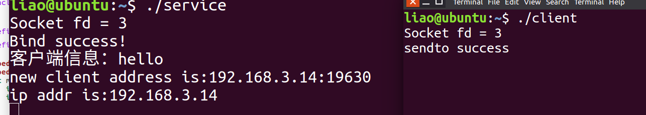 typedef struct sockaddr_in SIN;int main() {int sockfd;int ret;int reuse = 1;// 创建UDP套接字sockfd = socket(AF_INET, SOCK_DGRAM, 0); // 创建一个IPv4的UDP套接字,返回套接字描述符sockfdif (sockfd < 0) {perror("socket创建失败");return -1;}printf("Socket fd = %d\n", sockfd);// 初始化服务器地址结构:、设置IPv4协议族、端口号(PORT_NUM,网络字节序)和服务器IP地址(SERVER_IP)SIN seraddr; bzero(&seraddr, sizeof(SIN)); //清零seraddr.sin_family = AF_INET; // 指定使用IPv4地址族seraddr.sin_port = htons(PORT_NUM); // 将主机字节序的端口号转换为网络字节序并赋给端口字段seraddr.sin_addr.s_addr = inet_addr(SERVER_IP); // 将字符串形式的服务器IP地址转换为网络字节序并赋给地址字段setsockopt(sockfd, SOL_SOCKET, SO_REUSEADDR, &reuse, sizeof(reuse)); // 设置套接字选项,允许端口地址复用ret = bind(sockfd, (SA *)&seraddr, sizeof(SIN)); // 将套接字sockfd与服务器地址结构seraddr绑定if (ret == -1) {perror("bind failed");exit(0);}printf("Bind success!\r\n");//接收对应客户端信息char buf[10] = {0};SIN cliaddr = {0};socklen_t addrlen = sizeof(SIN);ret = recvfrom(sockfd, buf, sizeof(buf), 0, (SA*)&cliaddr, &addrlen);if(ret > 0) {printf("客户端信息:%s\r\n", buf);}//打印地址信息--直接法--对应客户端的IP地址printf("new client address is:%d.%d.%d.%d:%d\r\n",(cliaddr.sin_addr.s_addr)&0xff,(cliaddr.sin_addr.s_addr>>8)&0xff,(cliaddr.sin_addr.s_addr>>16)&0xff ,(cliaddr.sin_addr.s_addr>>24)&0xff,cliaddr.sin_port);//可以输出对应的IP地址 printf("ip addr is:%s\n", inet_ntoa(cliaddr.sin_addr));//创建父子进程ret = fork();if(ret == 0) { //子进程,接收客户端发送过来的数据char r_buf[10] = {0};while(1) {if(recvfrom(sockfd, r_buf, sizeof(r_buf), 0, (SA*)&cliaddr, &addrlen)) {printf("客户端:%s\r\n", r_buf);}memset(r_buf, 0, sizeof(r_buf));}}else { //父进程,发送数据char t_buf[10] = {0};while (1) {fgets(t_buf, sizeof(t_buf), stdin); // 从标准输入读取一行数据到bufsendto(sockfd, t_buf, strlen(t_buf), 0, (SA*)&cliaddr, addrlen); // 将buf中的数据发送到指定客户端地址cliaddrmemset(t_buf, 0, sizeof(t_buf));}}