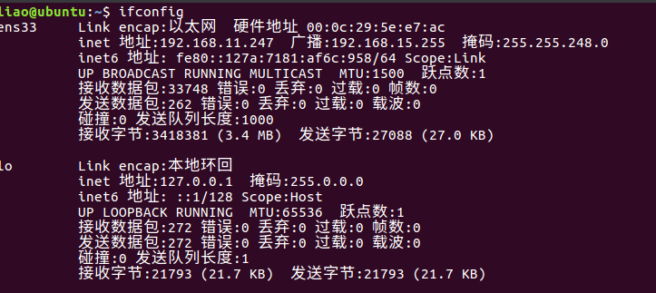 ens33 Link encap:以太网 硬件地址 00:0c:29:5e:e7:acinet 地址:192.168.11.247 广播:192.168.15.255 掩码:255.255.248.0