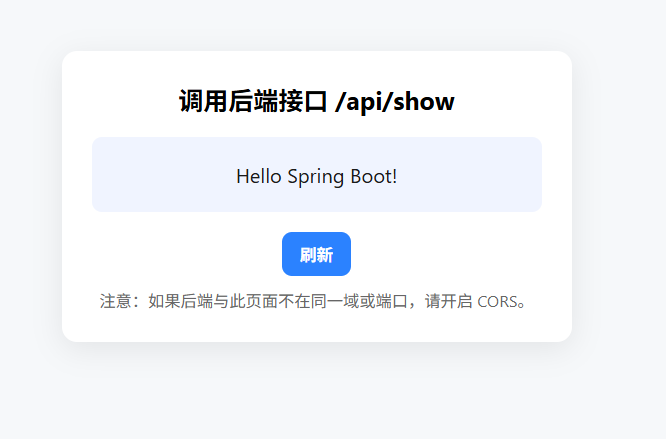 <div class="card"><h1>调用后端接口 /api/show</h1><div id="result">正在加载…</div><div><button id="refreshBtn">刷新</button></div><div class="hint">注意:如果后端与此页面不在同一域或端口,请开启 CORS。</div>