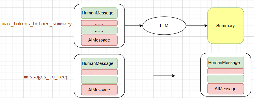 max_tokens_before_summary指定了进行汇总时的阈值,超过该阈值则执行汇总操作。messages_to_keep指定保留的消息条数。就是说把messages_to_keep之外的消息进行汇总瘦身,最后messages_to_keep的消息原封不动保留,把summary和messages_to_keep对应的消息作为新的消息队列。