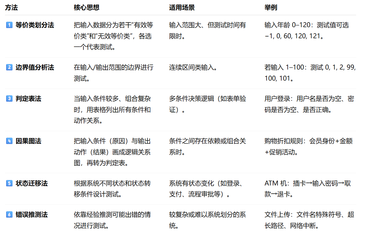 常用于:Web接口测试(知道接口逻辑,但不看底层代码)、数据库一致性测试(了解数据结构和约束)、模块间接口测试(掌握输入输出结构)