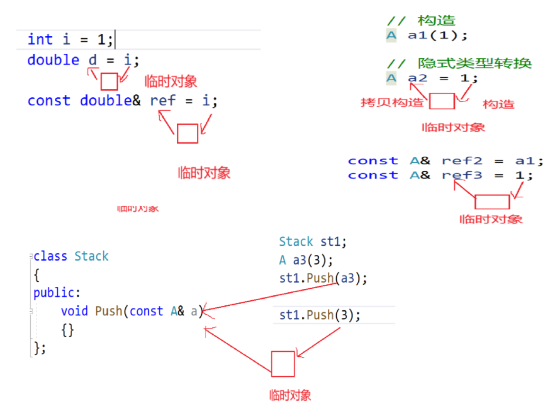 #include<iostream> using namespace std; class A { public://构造函数explict就不再支持隐式类型转换了//explict A(int a1)//这里的构造函数参数有相关内置类型A(int a1):_a1(a1){} private:int _a1 = 1;int _a2 = 2; };void func(const A& aa=1) {}class Stack { public:void Push(const A& a){}};int main() {//1.内置类型之间的隐式类型转换int i = 1;double d = i;const double& ref1 = i;//这个我们之前也讲过,中间的临时对象具有常性//2.内置类型和类类型之间的隐式转换//需要有相关内置类型为参数的构造函数//这样写是直接构造A a1(1);//这个才涉及到隐式类型转换A a2 = 1;const A& ref2 = a1;const A& ref3 = 1;//三种都可以,因为上面的函数参数是用过const修饰的(所以第二种也ok)func(a1);func(1);func();//我们再来看看别的使用场景Stack s1;//这样写有点麻烦了A a3(3);s1.Push(a3);//我们可以直接这样,方便了很多s1.Push(3);return 0; } - 多参数转化以及类和类之间的隐式类型转换