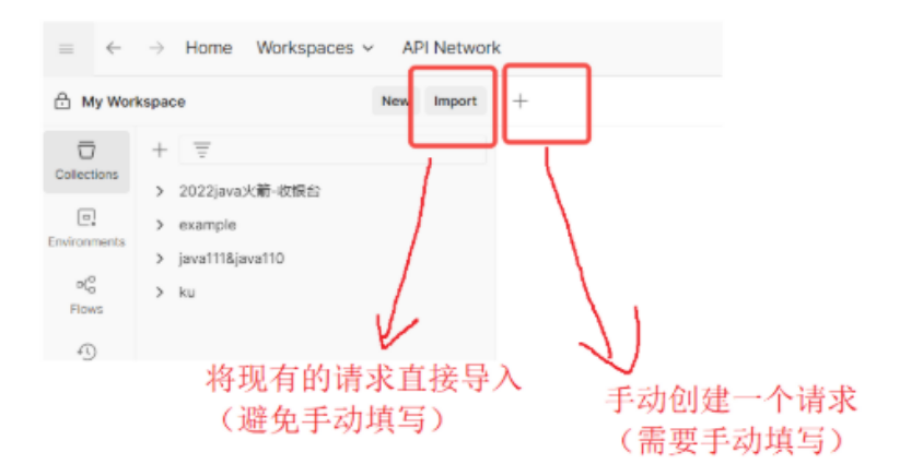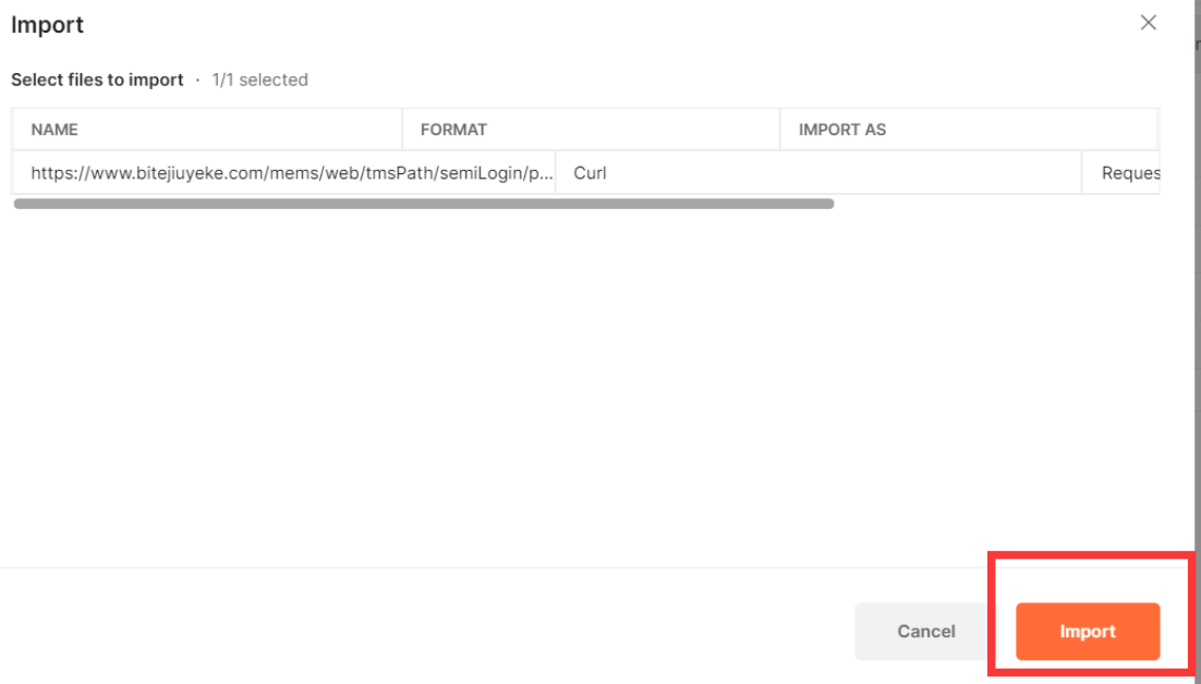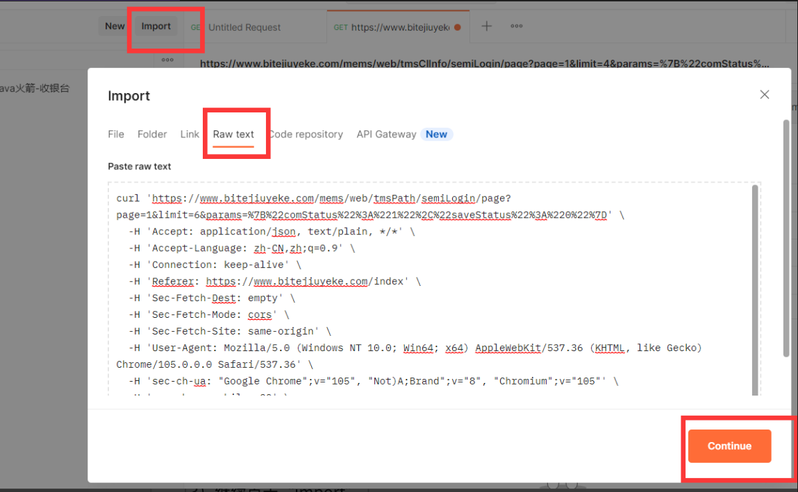 2)打开postman,点击“import”按钮,选择"Raw text"⽅式导⼊请求,将复制好的URL粘贴到⽂本框中,选择“continue”
