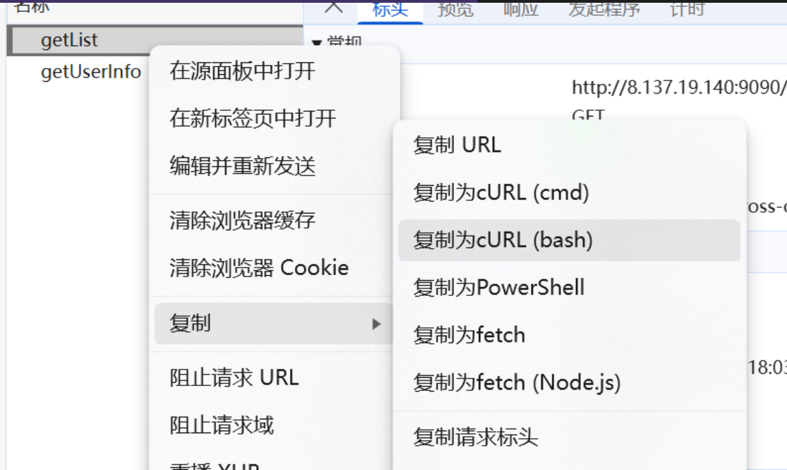 1)打开⻚⾯开发者⼯具,选中要复制的接⼝,右键复制URL