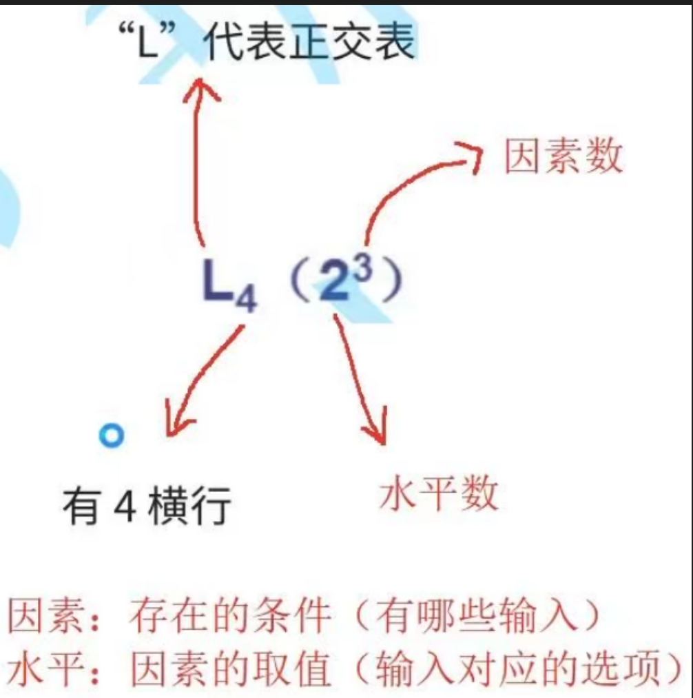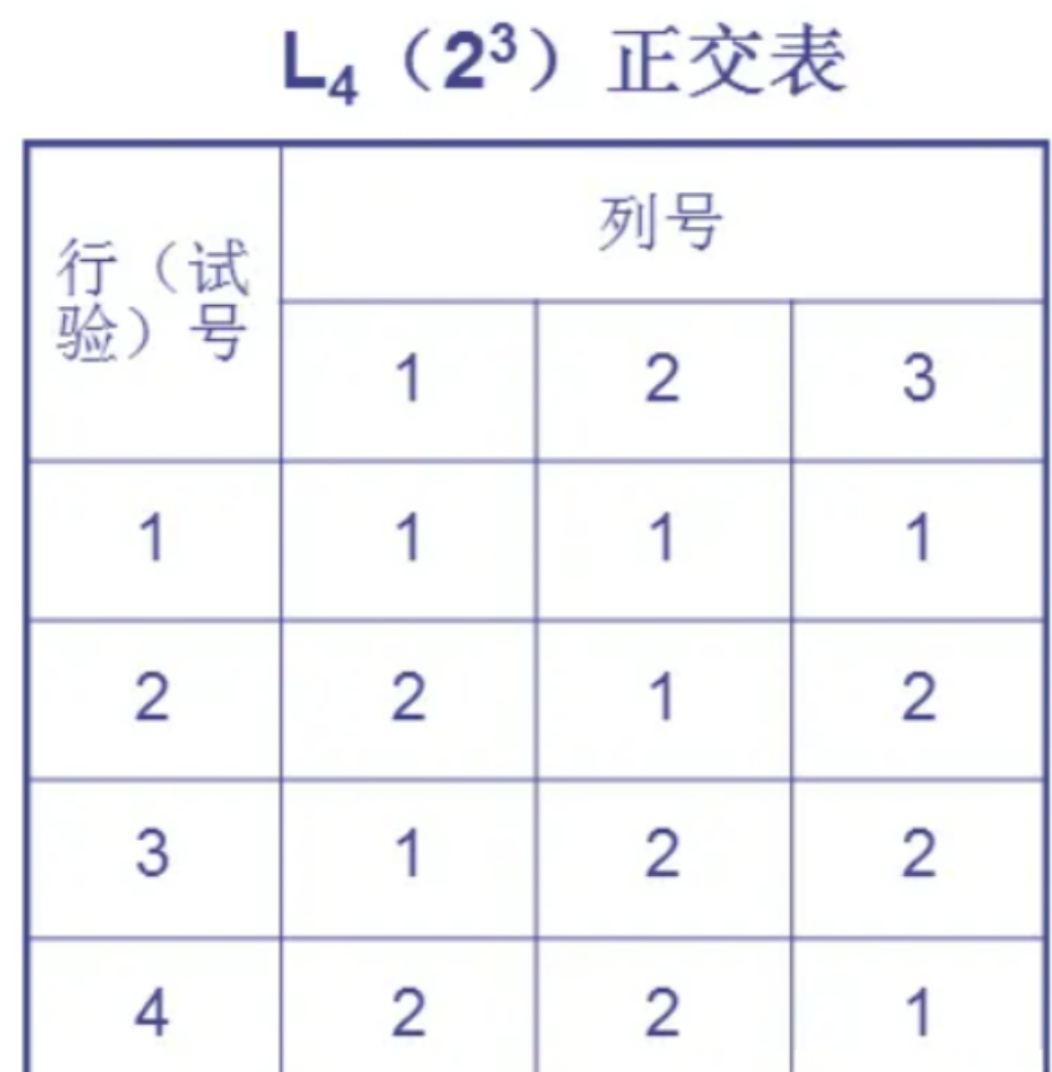 如图最简单的正交表是L(4)(2(3)),含意如下:“L”代表正交表;L 下⻆的数字“4”表⽰有 4 横⾏,简称⾏,即要做四次试验;括号内的指数“3”表⽰有3 纵列,简称列,即最多允许安排的因素是3个;括号内的数“2”表⽰表的主要部分只有2 种数字,即因素有两种⽔平1与2