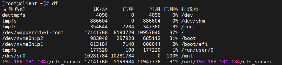 [root@client ~]# mount -t nfs  192.168.131.134:/nfs_server /nfs_client