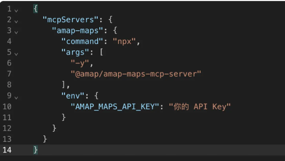 {"mcpServers": {"amap-maps": {"command": "npx","args": ["-y","@amap/amap-maps-mcp-server"],"env": {"AMAP_MAPS_API_KEY": "改成你的 API Key"}}}