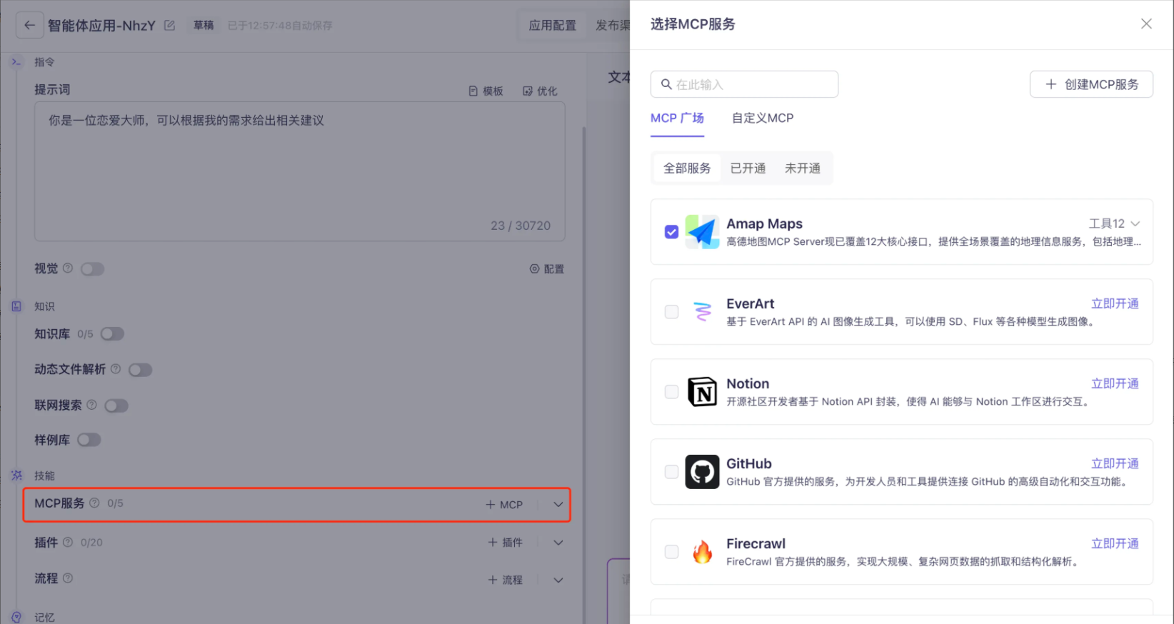 进入一个智能体应用,在左侧可以点击添加MCP服务,然后选择想要使用的MCP服务即可,比如使用高德地图MCP服务。