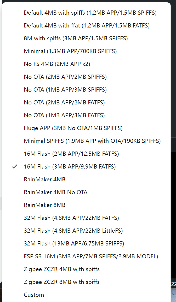 工具→Partition Scheme→16MB Flash (3MB APP, 9.5MB FATFS)