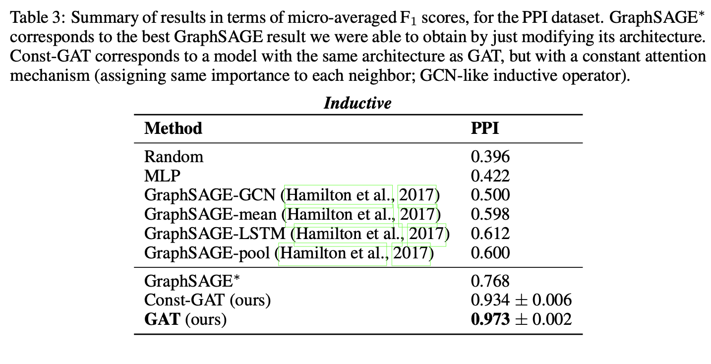 - PPI数据集提升显著:GAT模型比最佳GraphSAGE结果提高20.5%,证明模型在归纳场景的应用潜力;相比Const-GAT提升3.9%,直接验证了差异化注意力权重的重要性。