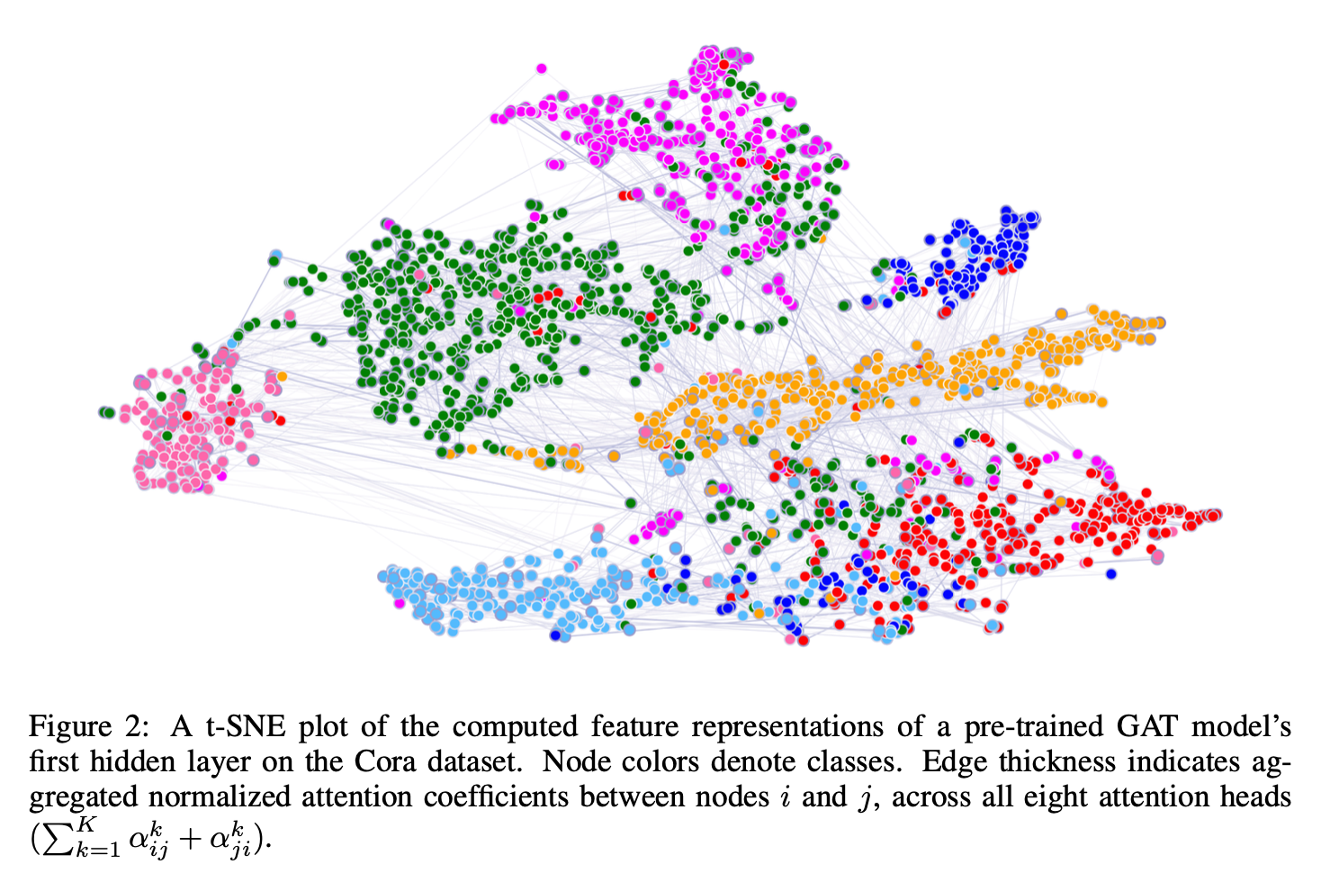 通过t-SNE降维可视化Cora数据集预训练GAT模型第一层提取的特征(图2)。投影后的二维空间呈现清晰聚类,对应数据集的七类主题标签,证实模型判别能力。同时展示了八头注意力系数的归一化强度分布,其具体解释需结合领域知识(如Bahdanau等2015年的方法),留待未来研究。