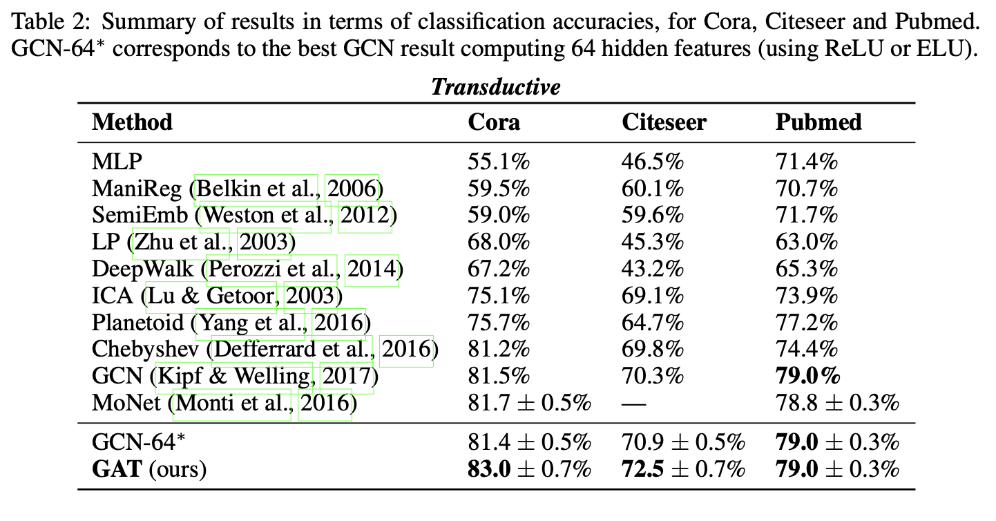 - Cora和Citeseer数据集上分别比GCN提升1.5%和1.6%,表明对同邻域节点分配不同权重具有优势。