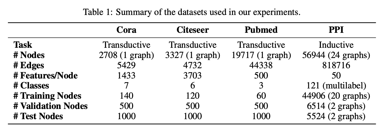 采用三个标准引文网络基准数据集——Cora、Citeseer和Pubmed(Sen等,2008),并严格遵循Yang等(2016)的直推式实验设置。这些数据集中,节点代表文档,边代表(无向的)引用关系。节点特征对应文档的词袋表示元素,每个节点带有类别标签。每类仅允许20个节点用于训练,但根据直推式设置,训练算法可访问所有节点的特征向量。训练模型的预测能力在1000个测试节点上评估,并额外使用500个节点进行验证(与Kipf & Welling(2017)的设置相同)。