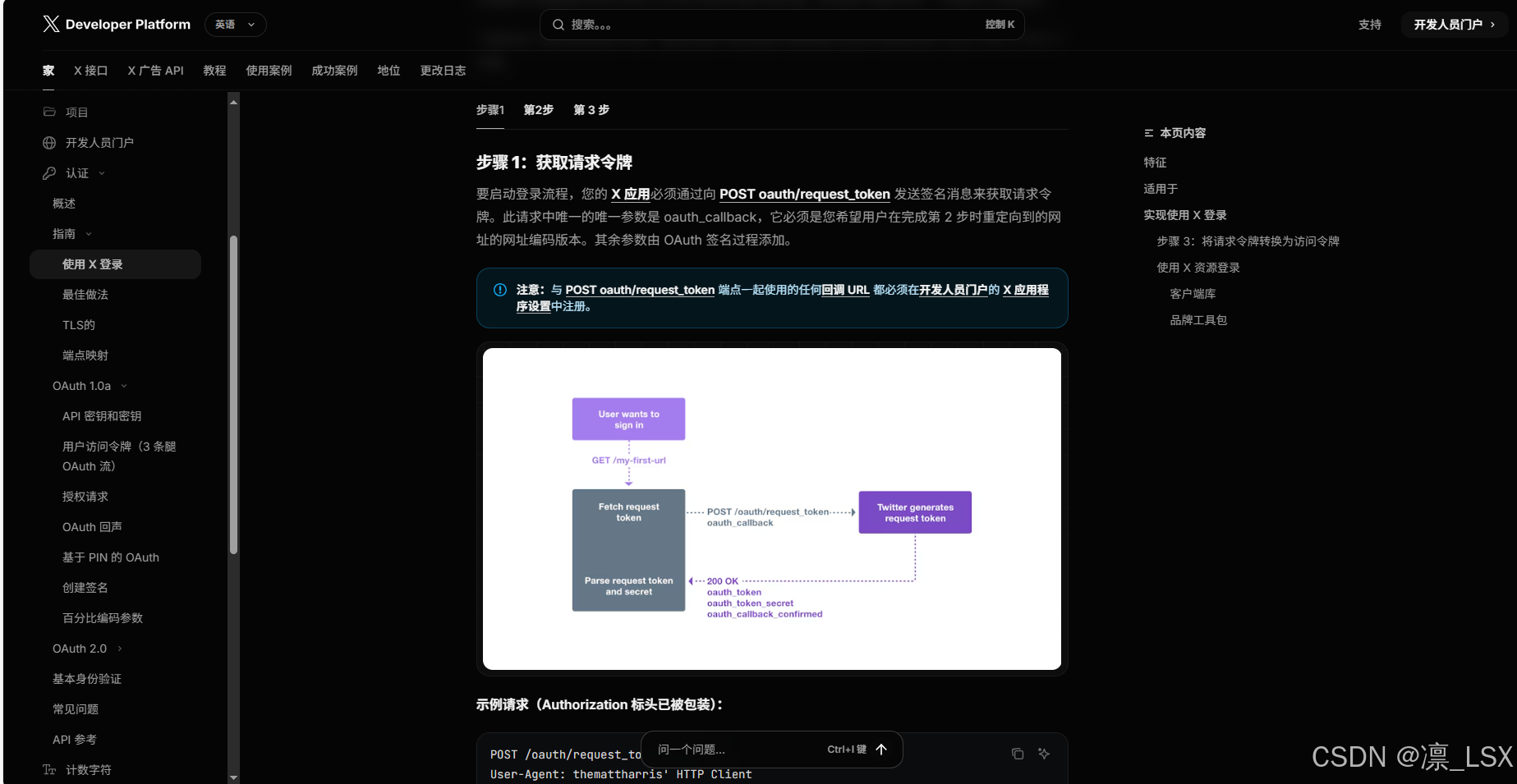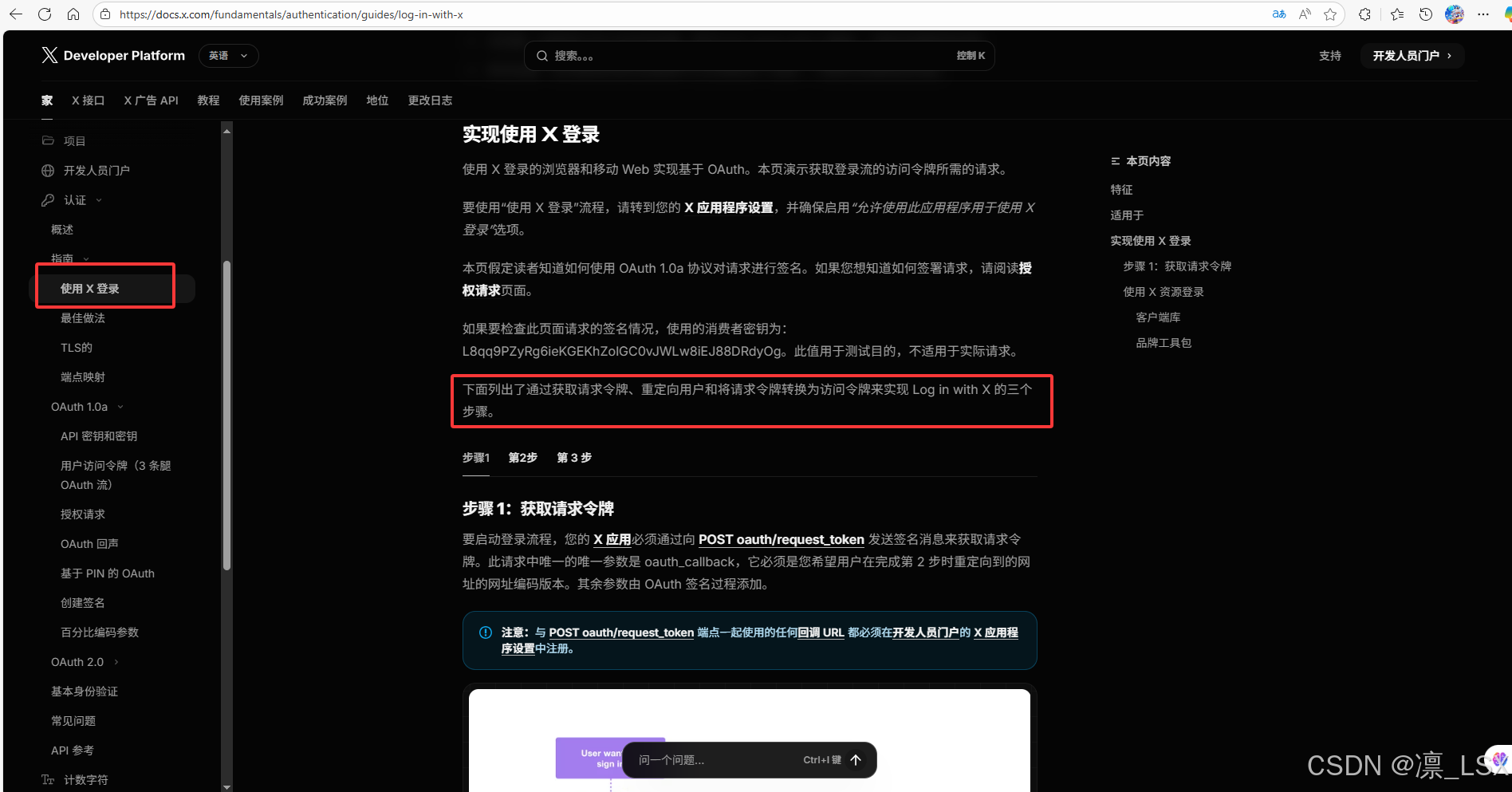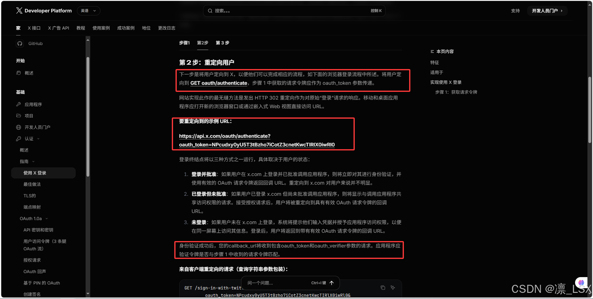 看完授权请求后回到之前的使用X登录,根据文档可知需要3个步骤完成登录
