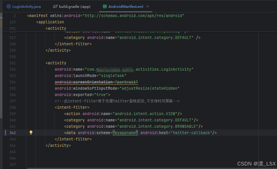 对进行三方登录的Activity配置intent-filter以接收twitter后台配置的callback,同时记得把activity进行exported,我后台配置的callback是myappname://twitter-callback,看完你应该也知道怎么填了,如果你使用twitter官方案例callback,http://localhost/sign-in-with-twitter/,那scheme应该是http,host应该是localhost/sign-in-with-twitter