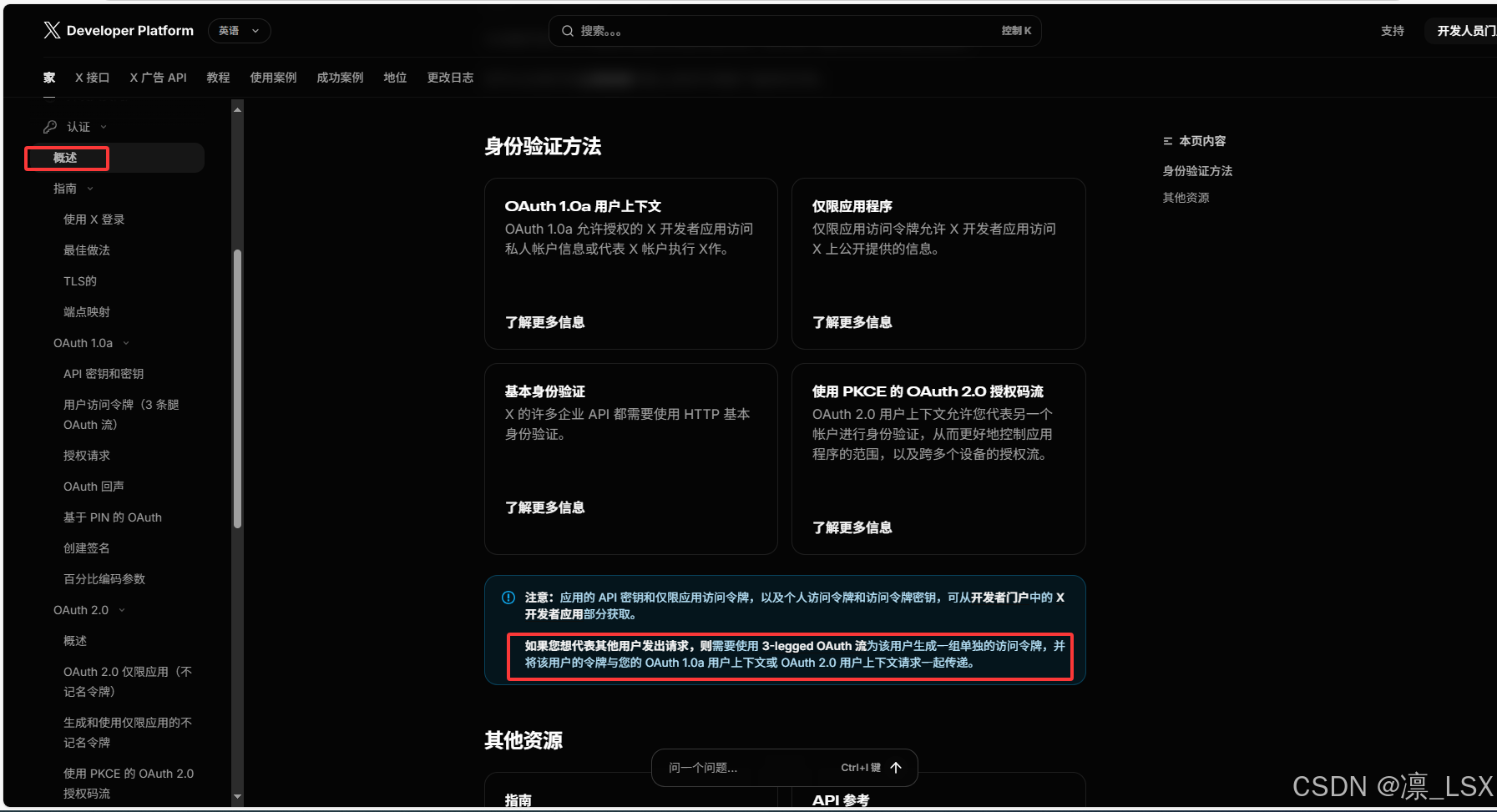 先看看概述,这里面有说到几种身份验证方法,并且在注意里面特意提到要代表其它用户发请求需要使用3-legged Oauth生成令牌,并使用OAuth 1.0a或者OAuth2.0传递,那我们后面使用的身份验证就是OAuth 1.0a或者是PKCE的OAuth 2.0