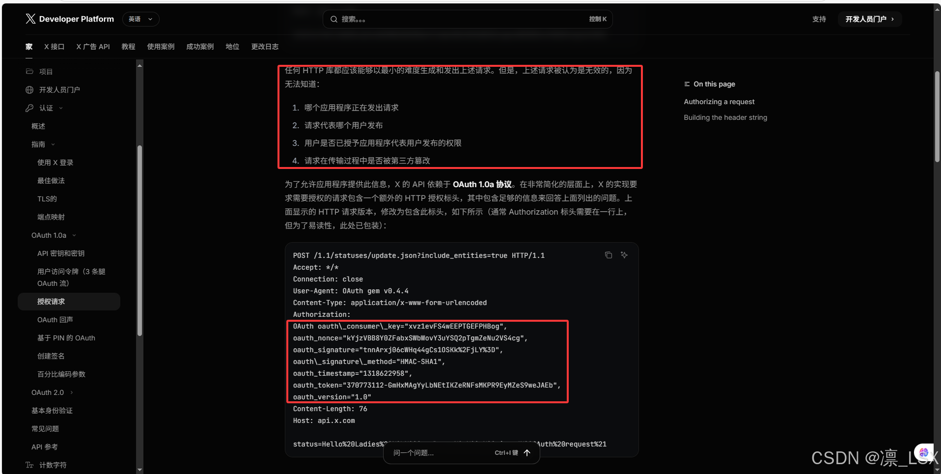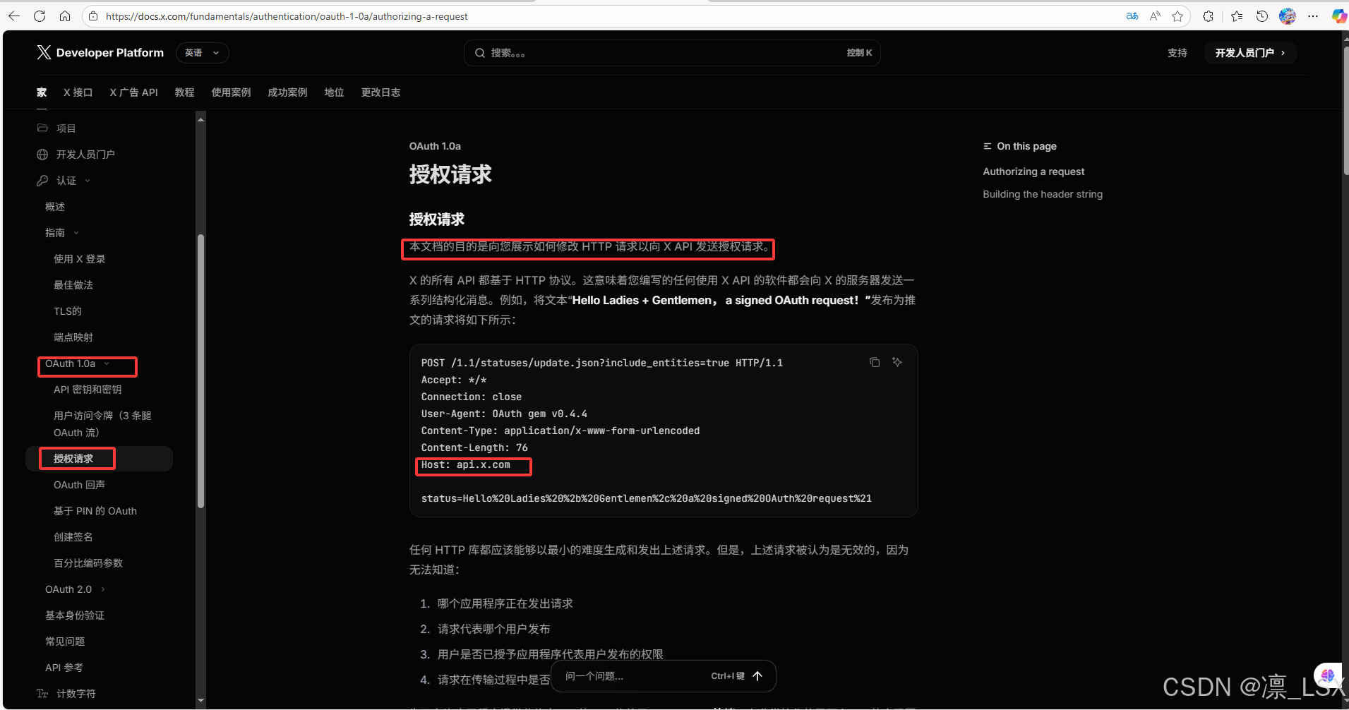 点到OAuth 1.0a的授权请求页面看看,文档说需要修改http请求以向X API发送授权请求,host是api.x.com 这个后续会用到,继续往下看