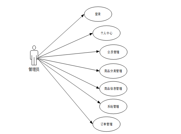 (a) 管理员;管理员使用本系统涉到的功能主要有:首页、个人中心、会员管理、商品分类管理、商品信息管理、系统管理、订单管理等功能。管理员用例图如图3-1所示。