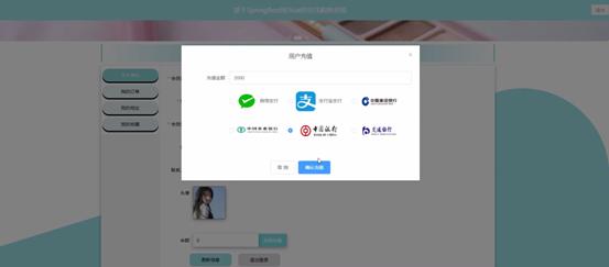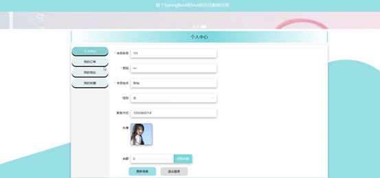 个人中心,会员在个人中心页面可以查看我的订单、我的地址、我的收藏,可对个人信息进行编辑会员账号、密码、会员姓名、性别、联系方式、头像、余额,以及会员对个人信息更新操作,退出登录,也可以点击充值,如图5-12 5-13 5-14 5-15 所示。