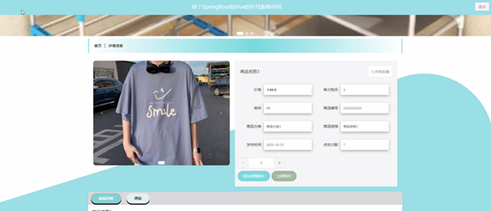 商品信息,在商品信息页面查看商品编号、商品名称、商品分类、商品规格、商品图片、发布时间、单限、库存、价格、点击次数等信息,如有需要进行添加到购物车、立即购买、收藏或者评论等操作,如图5-11所示。