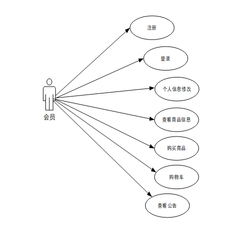 (b) 会员;进入系统前台可以实现首页、商品信息、公告信息、购物车、个人中心等功能进行操作。会员用例图如图3-2所示。
