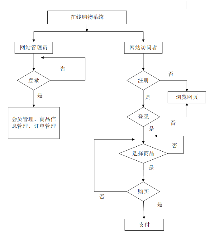 该流程图显示由会员进行浏览该网站的操作,顾客进入网站浏览商品,选择自己需要的商品,没有登录的会员都不能进行购买流程,都必须是注册会员点进去注册页面进行注册,注册登录成功的会员选择商品,点击进行支付的按钮,这样系统就会生成订单,管理员就可在后台看到会员下的订单。在线购物系统业务流程图3-3如图所示: