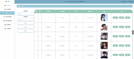 会员管理,在会员管理页面可以对会员账号、会员姓名、性别、联系方式、头像等内容,进行详情、修改、删除等操作,如图5-3所示。
