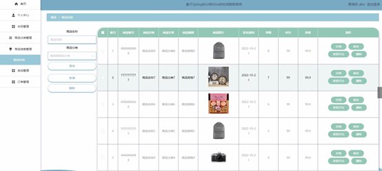 商品信息管理,在商品信息管理页面可以对商品编号、商品名称、商品分类、商品规格、商品图片、发布时间、单限、库存、价格等内容,进行详情、修改、删除等操作,如图5-5所示。