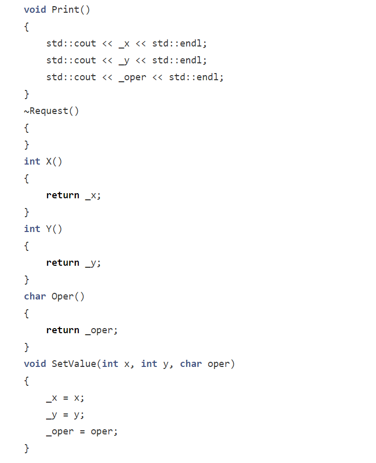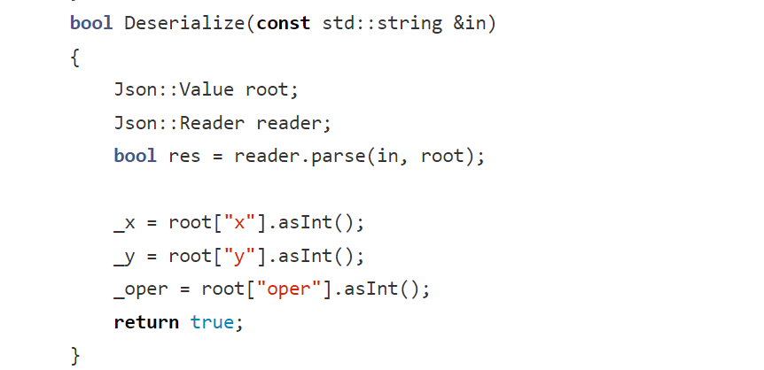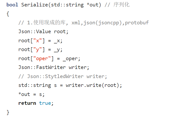 class Request { public:Request(){}Request(int x, int y, char oper) : _x(x), _y(y), _oper(oper){}bool Serialize(std::string *out) // 序列化{// 1.使用现成的库, xml,json(jsoncpp),protobufJson::Value root;root["x"] = _x;root["y"] = _y;root["oper"] = _oper;Json::FastWriter writer;// Json::StytledWriter writer;std::string s = writer.write(root);*out = s;return true;}bool Deserialize(const std::string &in){Json::Value root;Json::Reader reader;bool res = reader.parse(in, root);_x = root["x"].asInt();_y = root["y"].asInt();_oper = root["oper"].asInt();return true;}void Print(){std::cout << _x << std::endl;std::cout << _y << std::endl;std::cout << _oper << std::endl;}~Request(){}int X(){return _x;}int Y(){return _y;}char Oper(){return _oper;}void SetValue(int x, int y, char oper){_x = x;_y = y;_oper = oper;}private:int _x;int _y;char _oper; // + - * / % };我们一步一步来,我们先来看看请求部分的代码,我们既然是一个网络版本计算器,那么我们的核心数据我们就要约定好,我们这里只实现简单的加减乘除,因此我们就三个数据类型,分别是两个操作数和一个运算符,这也是我们双方关心的数据。