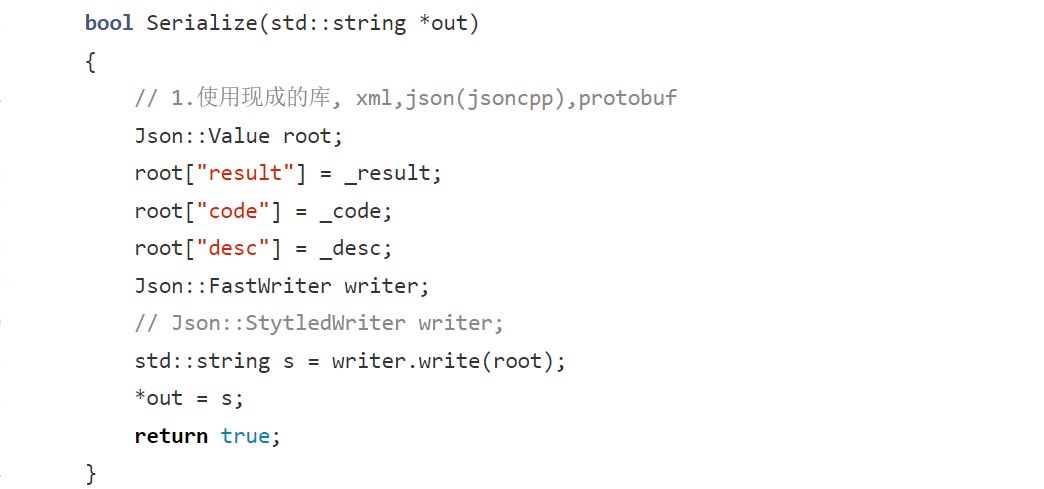 序列化过程就是调用我们上篇文章提到过的Jsoncpp类,我们直接使用线程的类就能满足我们的需求了,用法在上一篇文章中我也都做了详细的说明,这里我就大致说一说就可以了。我们先创建一个Json::Value的对象,然后将我们的三个变量和对应的值给填写进去,再通过我们的Json::FastWriter对象将我们的数据转换成字符串类型,让out带出我们的数据就可以了。