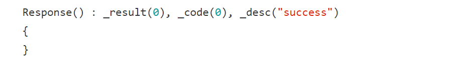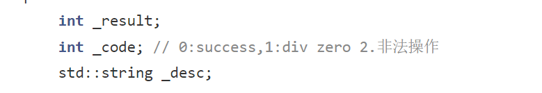 我们来看看我们三个成员变量,既然是响应,那么我们就需要result返回我们的计算结果了,同时,我们还可能面临我们的数据是存在问题的,所以还需要我们的code来表示我们运算结果的正确性,0表示成功,1表示出现了除零错误,2表示数据操作是非法的,比如运算符没给对等等。desc就是对我们本次处理结果的描述。