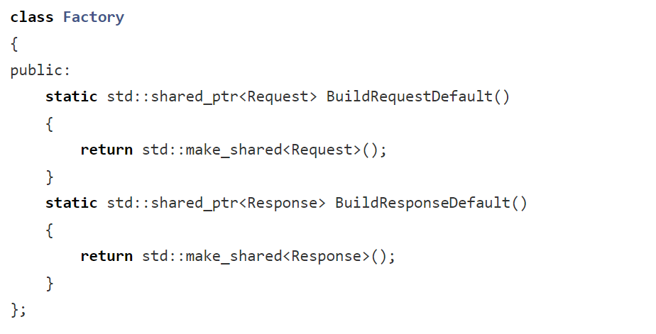 我们采用工厂模式,也就是通过智能指针的方式让上层获取请求与响应的对象指针。采用工厂模式的好处如下:
