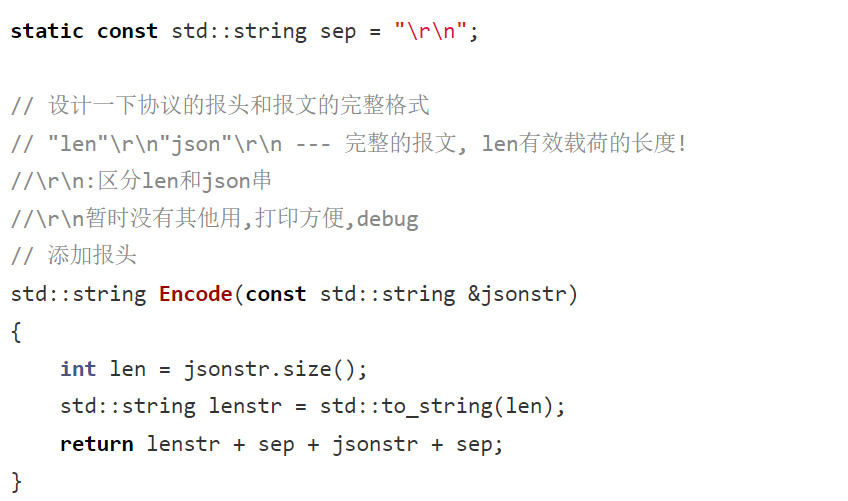 \r\n(定义为静态常量sep)作为分隔符,区分 “有效载荷长度” 和 “JSON 格式的有效载荷”,同时也作为报文的结束标识。- 长度字段(