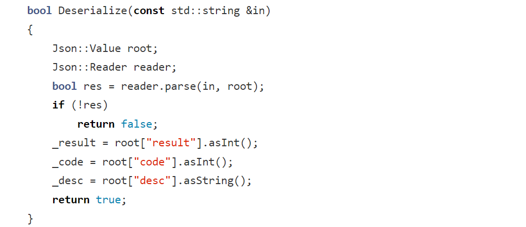 反序列化就是将我们的接收到的字符串进行解析,我们要创建Json::Reader类型的对象将我们的字符串内容解析成Json::Value类型的数据,解析成功后,我们就可以将三个参数对应的值从Json::Value对象中获取到了。