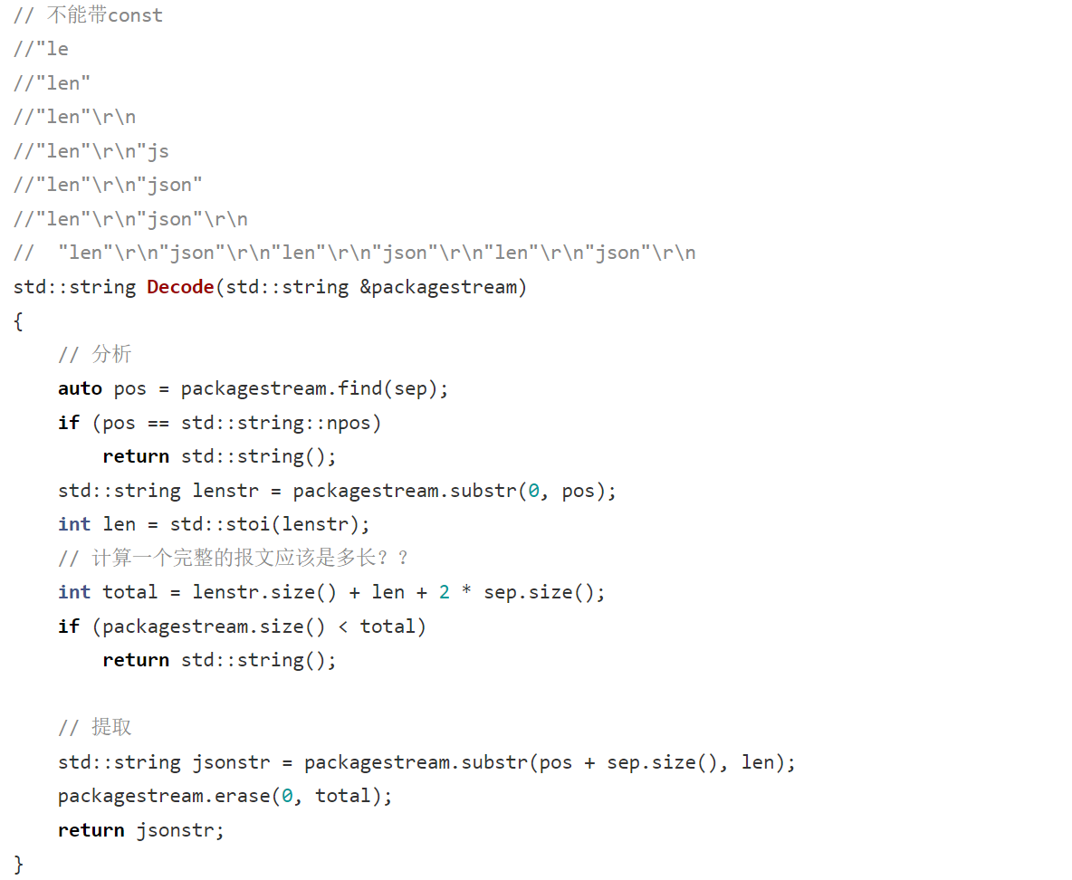 不同的系统或模块之间通信时,需要一套双方都认可的 “语言规则”。这段代码定义了 **“长度 + JSON 数据”** 的报文格式,让发送方和接收方对 “如何组织数据” 形成共识,确保数据能被正确理解和处理。