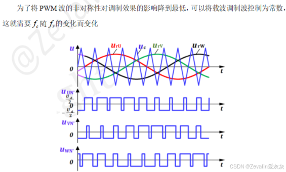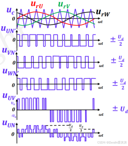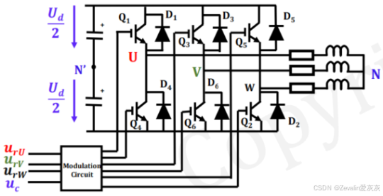 (3)使用三相电压型逆变器实现PWM调制的电路图如下,它的控制方式和单相逆变器是类似的,可以参考使用单相全桥电压型逆变器实现单极PWM调制的改善控制方式,控制U、V、W三点的电压,进而控制相电压。