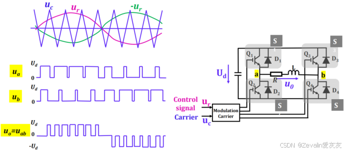 (2)使用单相全桥电压型逆变器实现单极PWM调制的电路图如下,其中为期望获得的输出电压,