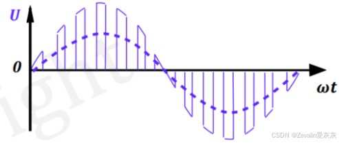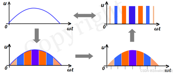 (2)应用等面积原理,可以使用一系列占空比不同的脉冲来表示半正弦波,如下图所示。