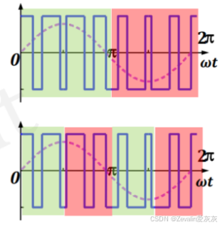 ②交流PWM调制:受调制的电流为交流量,设定一个子周期和PWM输出信号周期,每个子周期内按不同占空比“切割”交流量,即可实现交流PWM调制。