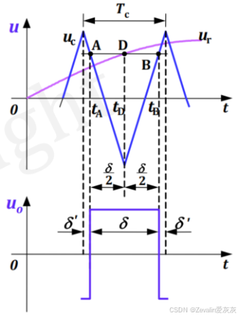 在前面介绍调制时,曾不断强调控制信号与期望的调制波进行比较,理论上这个比较无时无刻都需要进行,但这无疑会大量消耗控制器的算力,对此控制芯片一般会采取三角波均匀采样的方案,当控制信号的三角波达到峰值时,控制芯片将估算出控制三角波信号与期望调制波的交汇点距离当前时刻的时间,以此为依据进行PWM调制