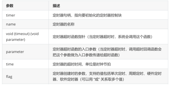 void rt_timer_init(rt_timer_t timer,const char* name,void (*timeout)(void* parameter),void* parameter,rt_tick_t time, rt_uint8_t flag);