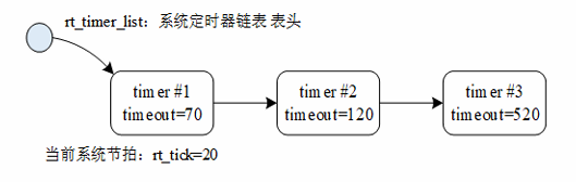2. 定时器链表 rt_timer_list。系统新创建并激活的定时器都会按照以超时时间排序的方式插入到 rt_timer_list 链表中
