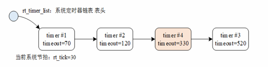 如果系统当前定时器状态在 10 个 tick 以后(rt_tick=30)有一个任务新创建了一个 tick 值为 300 的 Timer4 定时器,由于 Timer4 定时器的 timeout=rt_tick+300=330, 因此它将被插入到 Timer2 和 Timer3 定时器中间,形成如下图所示链表结构: