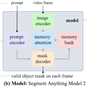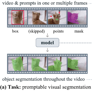 它在单帧上接收点、框或掩码提示,以定义要分割对象的空间范围,从而在时空上进行分割。