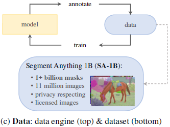 通过在数据收集循环中使用我们高效的模型,我们构建了迄今为止规模最大的分割数据集,包含超过 10 亿个掩码(masks),覆盖 1100 万张已授权且尊重隐私的图像。该模型被设计并训练为可提示(promptable)的形式,因此能够实现零样本迁移(zero-shot transfer),适应新的图像分布与任务。我们在多个任务上评估了它的能力,发现其零样本表现十分出色——往往可与甚至超越先前的全监督结果。我们现已在 segment-anything.com 上公开 Segment Anything Model (SAM) 及对应的数据集 SA-1B(包含 10 亿个掩码与 1100 万张图像),以促进计算机视觉领域基础模型的研究。