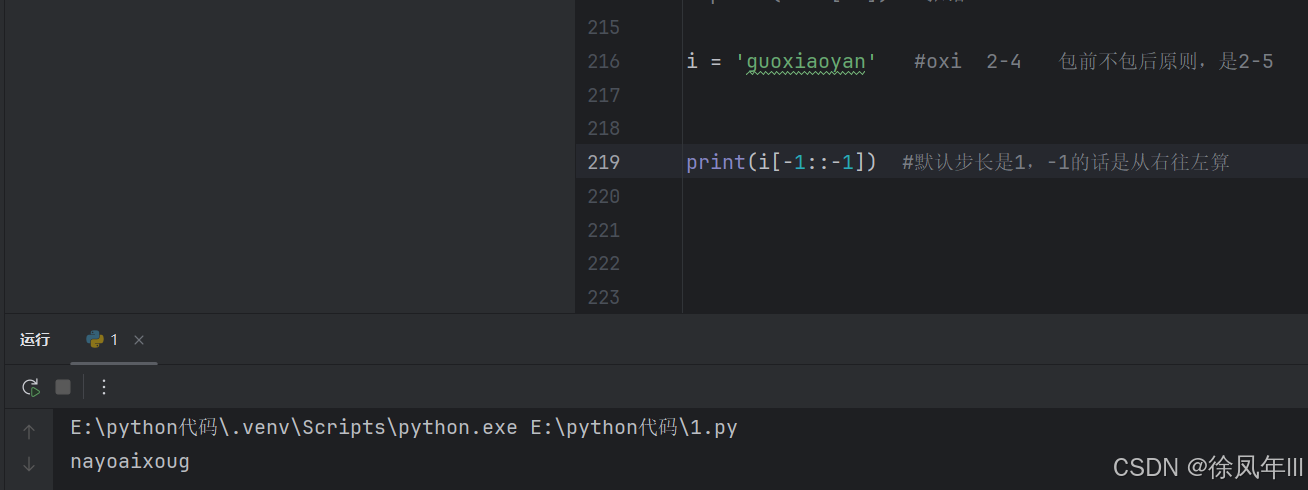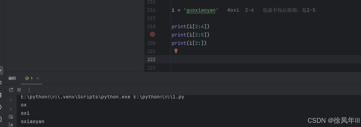 i = 'guoxiaoyan' #oxi 2-4 包前不包后原则,是2-5print(i[2:4])