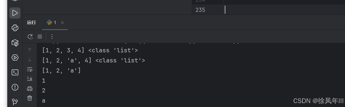 print(i,type(i)) #list 列表i = [1,2,'a',4]